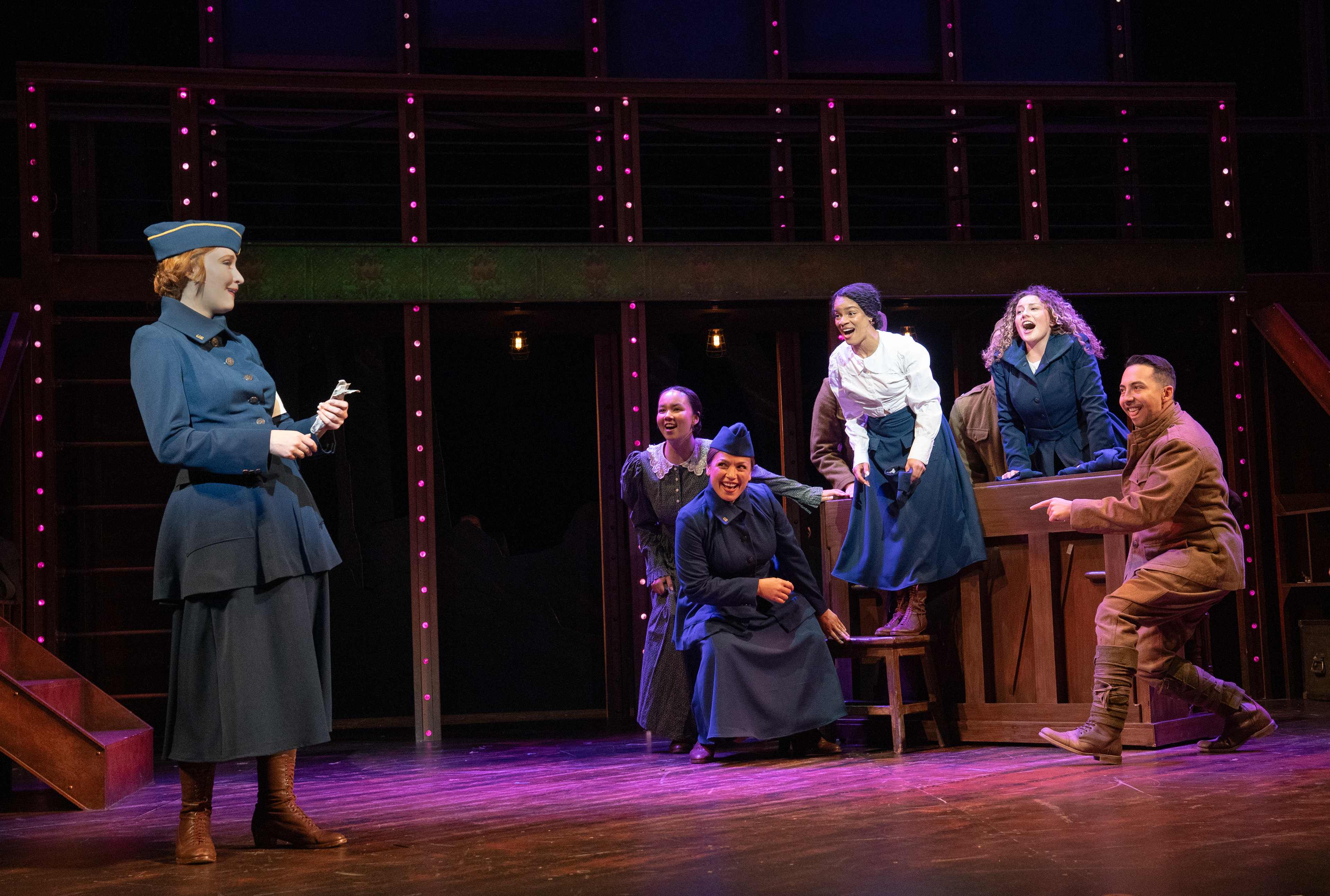 Chessa Metz (front) with cast members in the Syracuse Stage production of "The Hello Girls." September 9 - 28, 2025. Music and lyrics by Peter Mills. Book by Peter Mills and Cara Reichel. Directed by Cara Reichel. Co-produced with Michael Cassel Group, Broadway & Beyond Theatricals, and Chief Operator. Photo by Joan Marcus.
